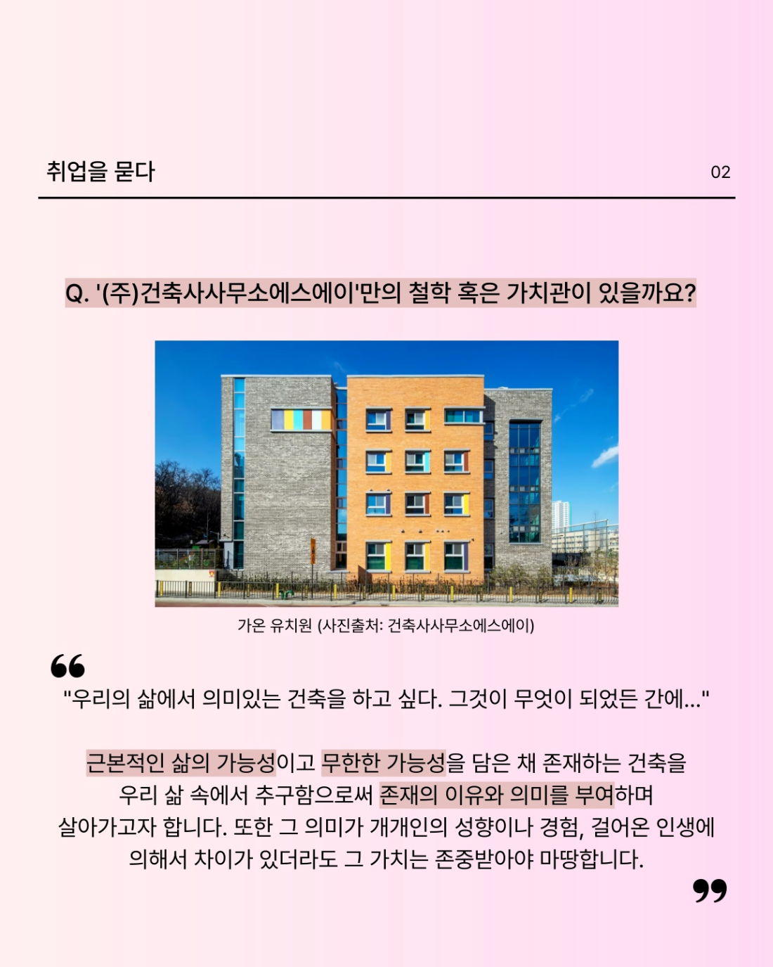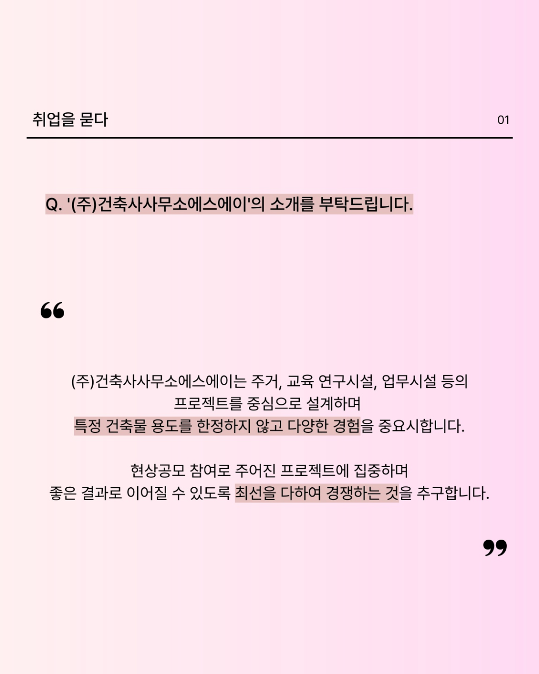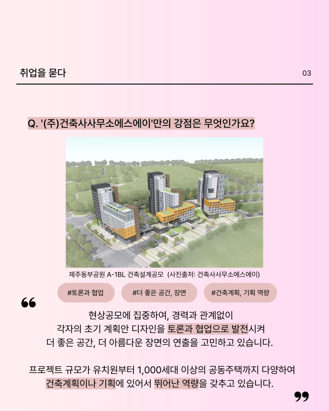 👉 (ÁÖ)°ÇÃà»ç»ç¹«¼Ò¿¡½º¿¡ÀÌ´Â ÁÖ°Å, ±³À° ¿¬±¸½Ã¼³, ¾÷¹«½Ã¼³ µîÀÇ ÇÁ·ÎÁ§Æ®¸¦ Áß½ÉÀ¸·Î ¼³°èÇÏ¸ç Æ¯Á¤ °ÇÃ๰ ¿ëµµ¸¦ ÇÑÁ¤ÇÏÁö ¾Ê°í ´Ù¾çÇÑ °æÇèÀ» Áß¿ä½ÃÇÕ´Ï´Ù. Çö»ó°ø¸ð Âü¿©·Î ÁÖ¾îÁø ÇÁ·ÎÁ§Æ®¿¡ ÁýÁßÇϸç ÁÁÀº °á°ú·Î À̾îÁú ¼ö ÀÖµµ·Ï ÃÖ¼±À» ´ÙÇÏ¿© °æÀïÇÏ´Â °ÍÀ» Ãß±¸ÇÕ´Ï´Ù.