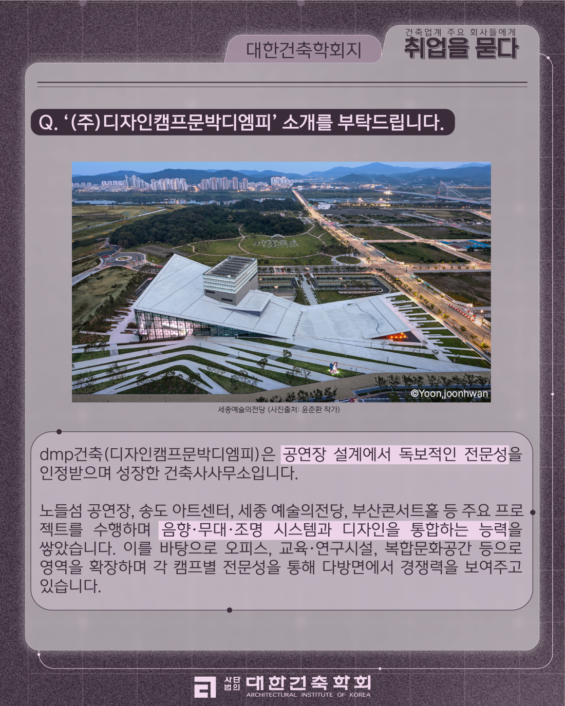 👉³ëµé¼¶ °ø¿¬Àå, ¼Ûµµ ¾ÆÆ®¼¾ÅÍ, ¼¼Á¾ ¿¹¼úÀÇÀü´ç, ºÎ»êÄܼƮȦ µî ÁÖ¿ä ÇÁ·Î Á§Æ®¸¦ ¼öÇàÇϸç À½Ç╹«´ë•Á¶¸í ½Ã½ºÅÛ°ú µðÀÚÀÎÀ» ÅëÇÕÇÏ´Â ´É·ÂÀ» ½×¾Ò½À´Ï´Ù. À̸¦ ¹ÙÅÁÀ¸·Î ¿ÀÇǽº, ±³À°•¿¬±¸½Ã¼³, º¹ÇÕ¹®È°ø°£ µîÀ¸·Î ¿µ¿ªÀ» È®ÀåÇÏ¸ç °¢ Ä·ÇÁº° Àü¹®¼ºÀ» ÅëÇØ ´Ù¹æ¸é¿¡¼ °æÀï·ÂÀ» º¸¿©ÁÖ°í ÀÖ½À´Ï´Ù.