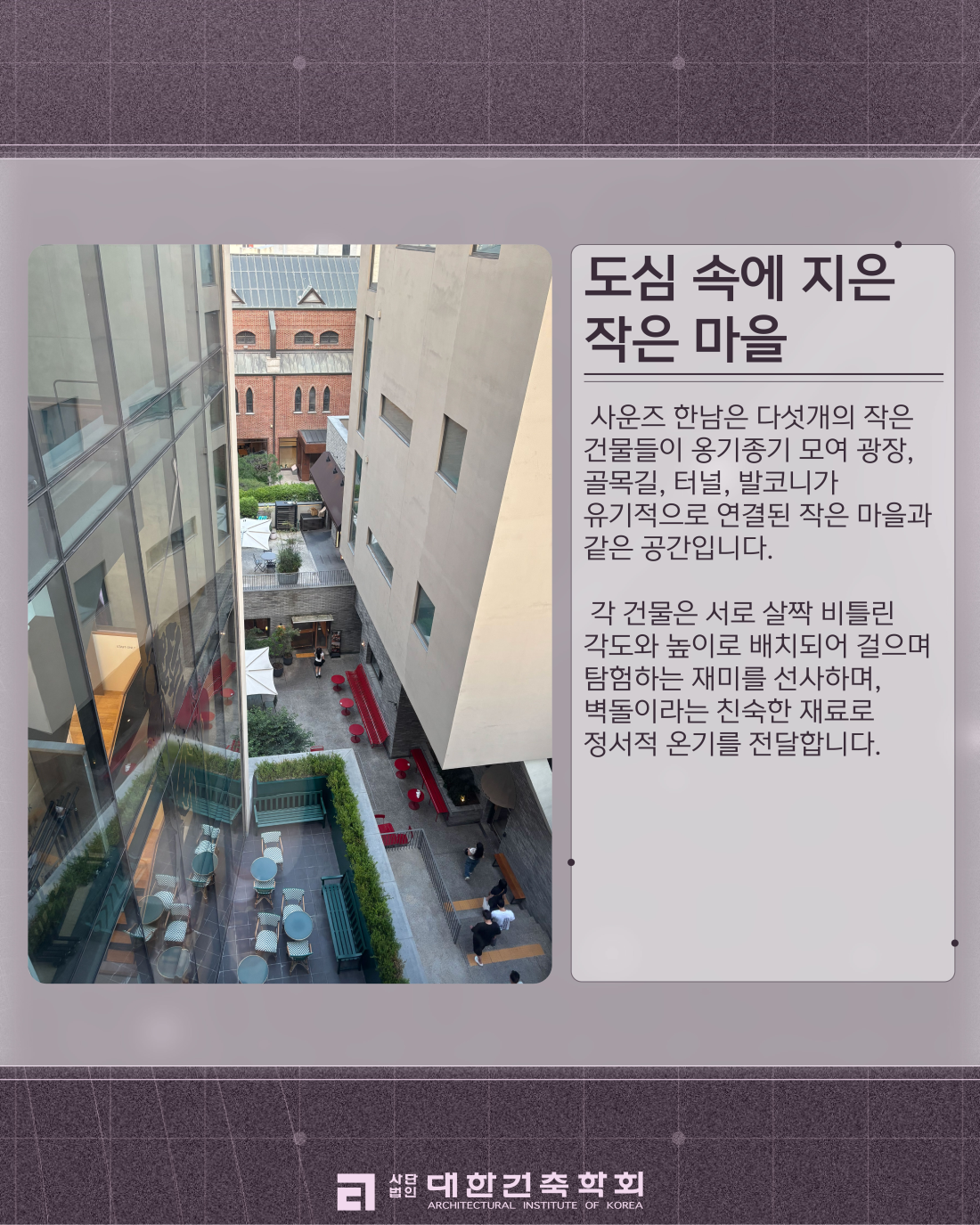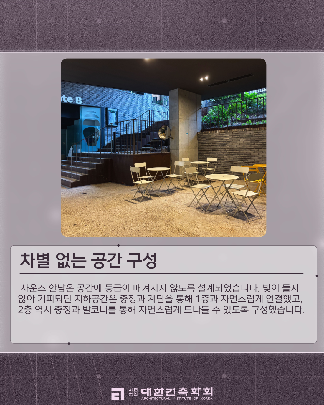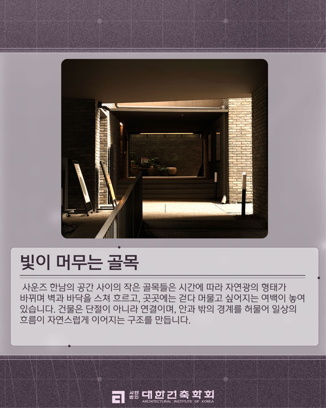 💡»ç¿îÁî Çѳ²ÀÇ °ø°£ »çÀÌÀÇ ÀÛÀº °ñ¸ñµéÀº ½Ã°£¿¡ µû¶ó ÀÚ¿¬±¤ÀÇ ÇüŰ¡ ¹Ù²î¸ç º®°ú ¹Ù´ÚÀ» ½ºÃÄ È帣°í, °÷°÷¿¡´Â °È´Ù ¸Ó¹°°í ½Í¾îÁö´Â ¿©¹éÀÌ ³õ¿© ÀÖ½À´Ï´Ù. °Ç¹°Àº ´ÜÀýÀÌ ¾Æ´Ï¶ó ¿¬°áÀ̸ç, ¾È°ú ¹ÛÀÇ °æ°è¸¦ Çã¹°¾î ÀÏ»óÀÇ È帧ÀÌ ÀÚ¿¬½º·´°Ô À̾îÁö´Â ±¸Á¶¸¦ ¸¸µì´Ï´Ù.