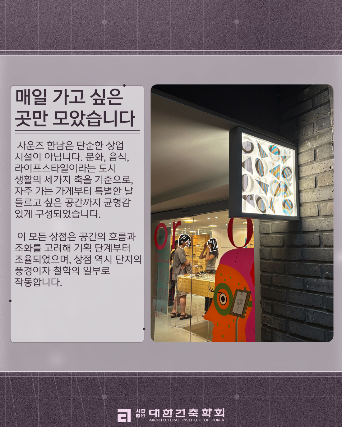 💡»ç¿îÁî Çѳ²Àº ´Ü¼øÇÑ »ó¾÷ ½Ã¼³ÀÌ ¾Æ´Õ´Ï´Ù. ¹®È, À½½Ä, ¶óÀÌÇÁ½ºÅ¸ÀÏÀ̶ó´Â µµ½Ã »ýȰÀÇ ¼¼°¡Áö ÃàÀ» ±âÁØÀ¸·Î ÀÚÁÖ °¡´Â °¡°ÔºÎÅÍ Æ¯º°ÇÑ ³¯ µé¸®°í ½ÍÀº °ø°£±îÁö ±ÕÇü°¨ ÀÖ°Ô ±¸¼ºµÇ¾ú½À´Ï´Ù.