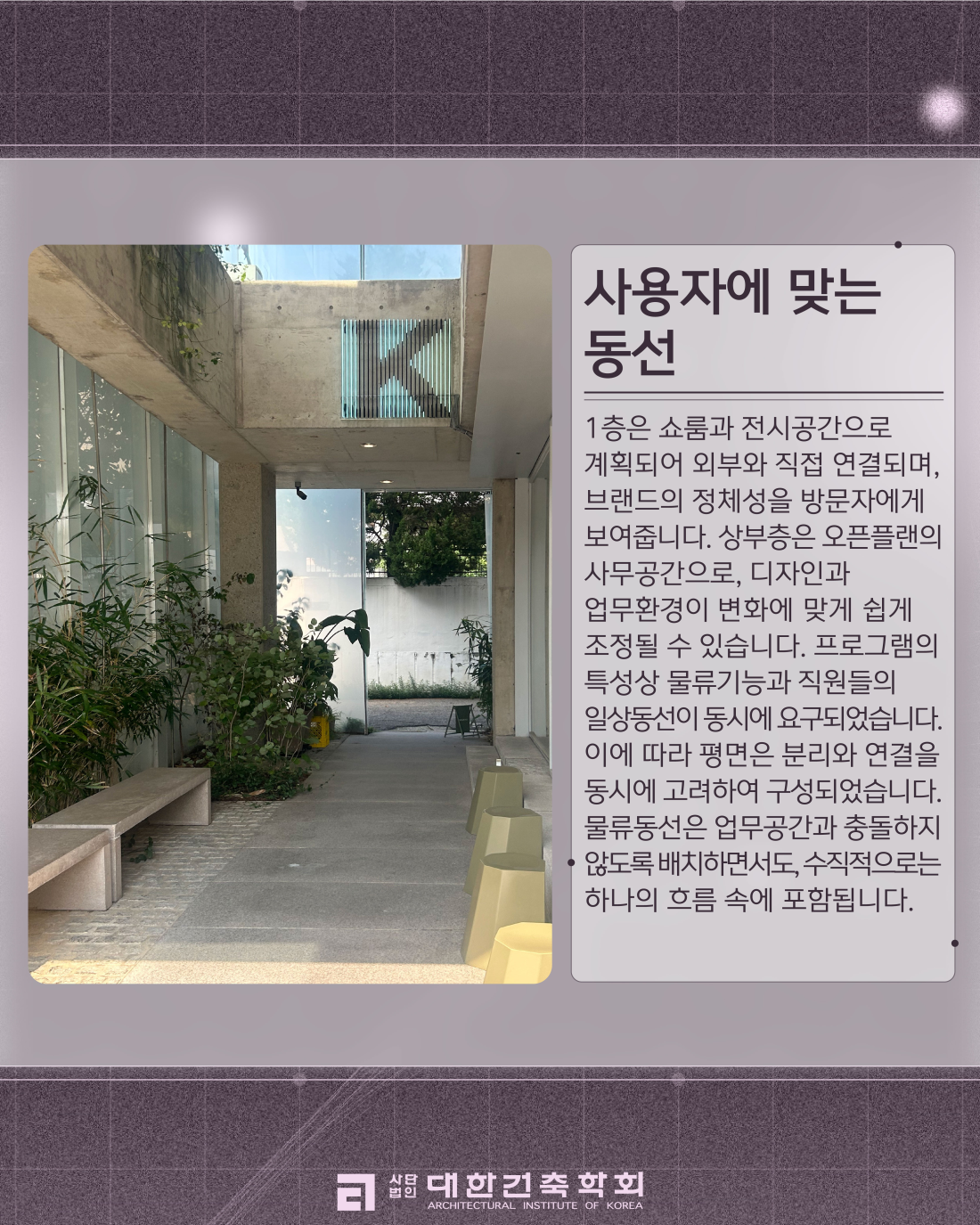 💡 1ÃþÀº ¼î·ë°ú Àü½Ã°ø°£À¸·Î °èȹµÇ¾î ¿ÜºÎ¿Í Á÷Á¢ ¿¬°áµÇ¸ç, ºê·£µåÀÇ Á¤Ã¼¼ºÀ» ¹æ¹®ÀÚ¿¡°Ô º¸¿©ÁÝ´Ï´Ù. »óºÎÃþÀº ¿ÀÇÂÇ÷£ÀÇ »ç¹«°ø°£À¸·Î, µðÀÚÀΰú ¾÷¹«È¯°æÀÌ º¯È¿¡ ¸Â°Ô ½±°Ô Á¶Á¤µÉ ¼ö ÀÖ½À´Ï´Ù. ÇÁ·Î±×·¥ÀÇ Æ¯¼º»ó ¹°·ù±â´É°ú Á÷¿øµéÀÇ Àϻ󵿼±ÀÌ µ¿½Ã¿¡ ¿ä±¸µÇ¾ú½À´Ï´Ù.