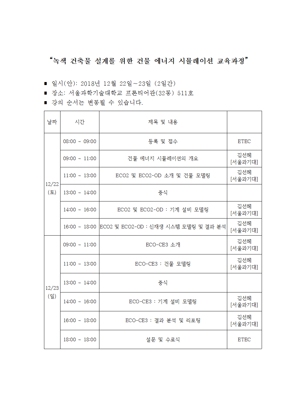 ´Ù¸§ÀÌ ¾Æ´Ï¶ó 2018³â 12¿ù 22ÀÏ(Åä) ~ 12¿ù 23ÀÏ(ÀÏ) ÀÌÆ²°£ "³ì»ö °ÇÃ๰ ¼³°è¸¦ À§ÇÑ °Ç¹° ¿¡³ÊÁö ½Ã¹Ä·¹ÀÌ¼Ç ±³À°°úÁ¤"¿¡ ±³À°À» ÁøÇàÇÕ´Ï´Ù.