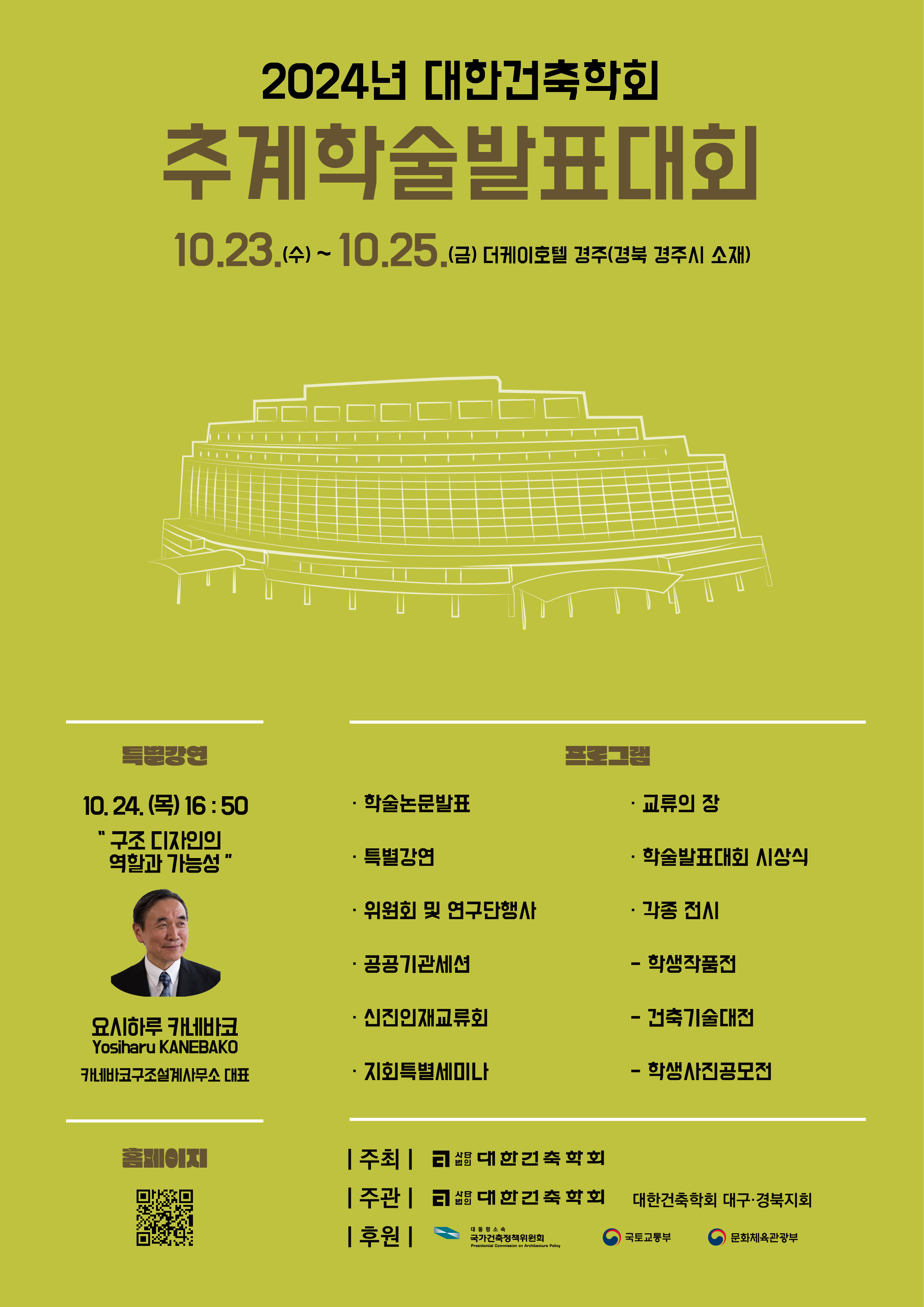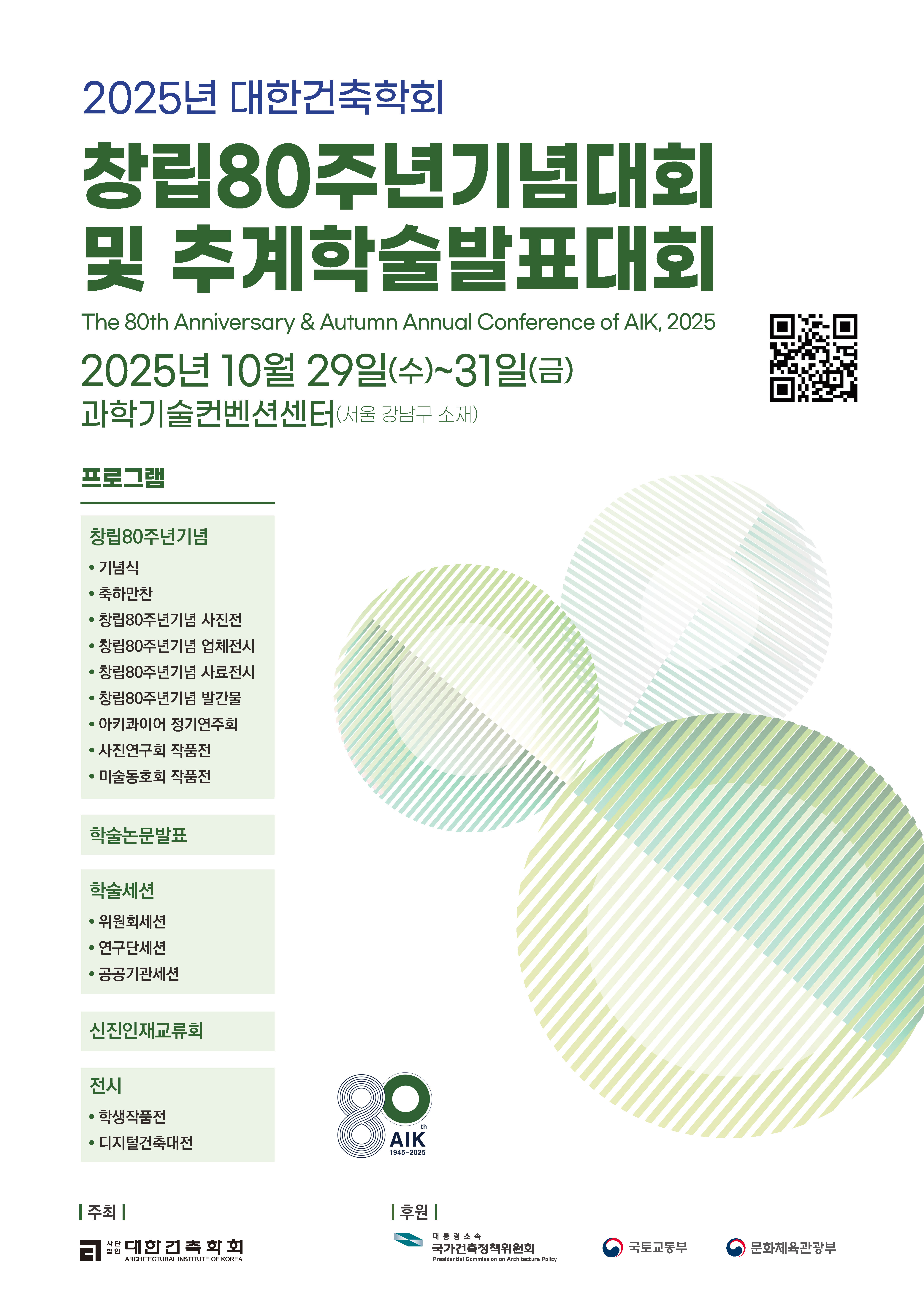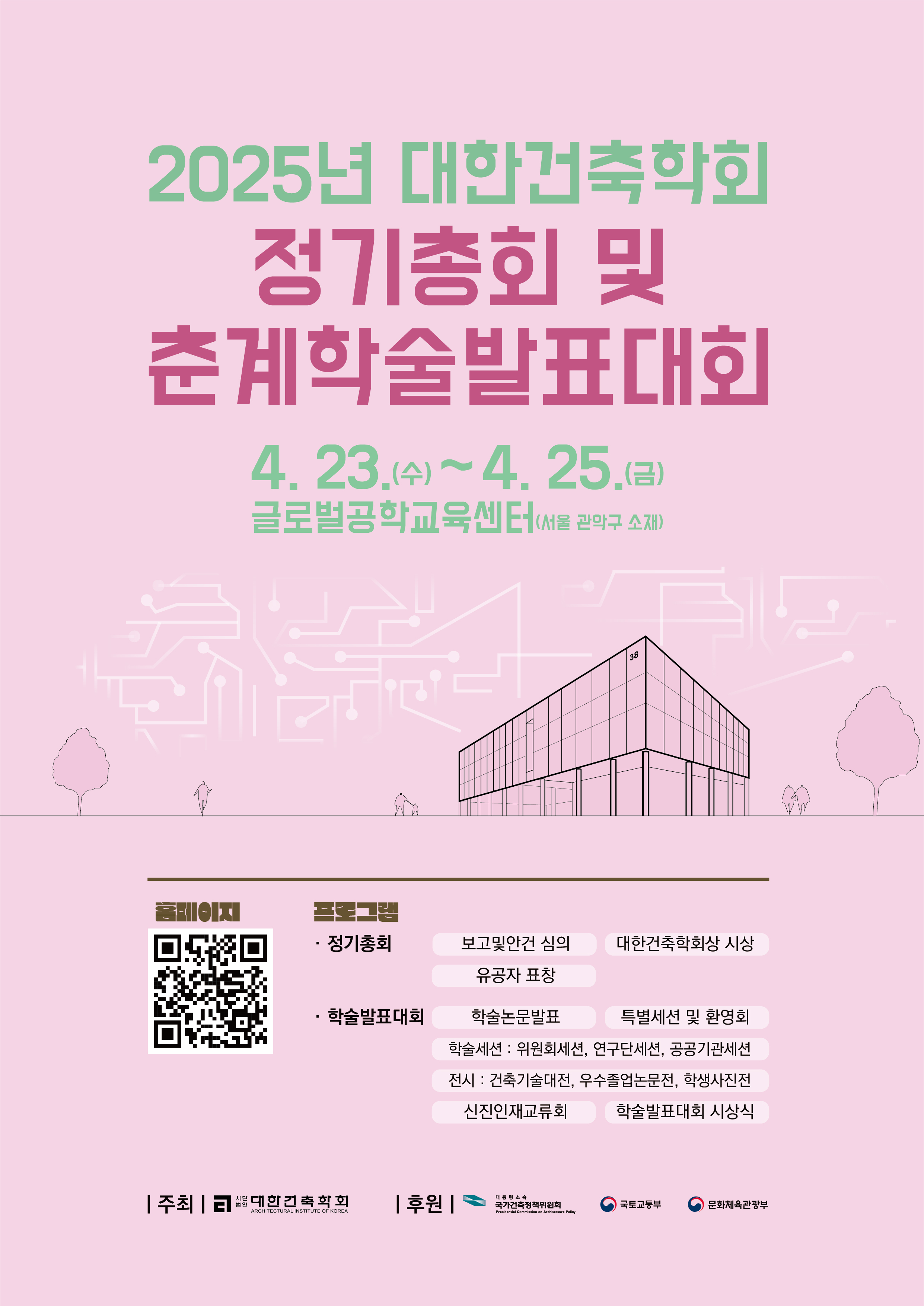 ¿ì¸® ÇÐȸ´Â 1945³â¿¡ ⸳µÈ ÀÌÈÄ °ÇÃàºÐ¾ß ¹ßÀü¿¡ ±â¿©ÇØ ¿ÔÀ¸¸ç, Àü¹®ÀûÀÎ °ÇÃàÀÎÀ» ¾ç¼ºÇϱâ À§ÇØ ¸¹Àº ³ë·ÂÇϰí ÀÖ½À´Ï´Ù. ±× ÀÏȯÀ¸·Î °ÇÃà°ü·Ã Àü°øÀÚµéÀÇ ÇÐÀ§³í¹® ¹ßÇ¥¸¦ ÅëÇØ ÃÖ±ÙÀÇ ¿¬±¸µ¿ÇâÀ» ÆÄ¾ÇÇϰí, ¿¬±¸ÀÚ°£ÀÇ Á¤º¸±³·ù¸¦ ÅëÇÏ¿© ¼±Áø Çй®Á¤º¸¸¦ Á¦°øÇϰí ÀÖ½À´Ï´Ù. ¶ÇÇÑ Çмú¹ßÇ¥´ëȸ´Â ´ÜÁö ¿¬±¸¼º°ú¹°À» ¹ßÇ¥ÇÏ´Â °Í¿¡¼ ¹þ¾î³ª º¯ÈÇÏ´Â °Ç¼³È¯°æ¿¡ µû¸¥ ´Éµ¿ÀûÀÎ ´ëó ¹æ¾ÈÀ» ¸ð»öÇϰí, ±¹³»¿ÜÀû Çö¾È¿¡ ´ëÇÑ ÇØ°á¹æ¾ÈÀ» µµÃâÇϱâ À§ÇÑ Åä·ÐÀÇ ÀåÀ̱⵵ ÇÕ´Ï´Ù. Çмú¹ßÇ¥´ëȸ´Â ÇöÀç ¸Å³â 4¿ù, 10¿ù µÎ Â÷·Ê¿¡ °ÉÃÄ °³Ãֵǰí ÀÖ½À´Ï´Ù.